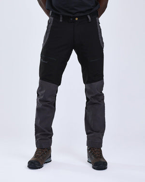Vielseitige und starke Hybridhose zum Wandern, Alltag und Jagen. Gewachste Oberfläche für zusätzliche wasserabweisende Eigenschaften. Verschweißte Nähte. Belüftungsreißverschlüsse auf beiden Seiten. Taschen mit RV. Verstellbare Beinenden. Schuh-Haken zum Fixieren am Schuh.