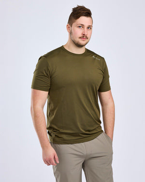 Das Herren-Performance-T-Shirt ist mit einer luftigem Mesh designed, wodurch Feuchtigkeit während intensiver Aktivitäten durch den Stoff entweichen kann. Das T-Shirt besteht aus