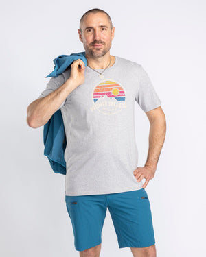 This soft T-shirt for men consists of 100% recycled materials, a blend of cotton and polyester, featuring a captivating Pinewood print on the front. What sets it apart is the way the fabric is dyed, derived from recycled materials, eliminating the need for a new dyeing process. This results in significant water and energy savings, yielding an eco-friendly, melange fabric.