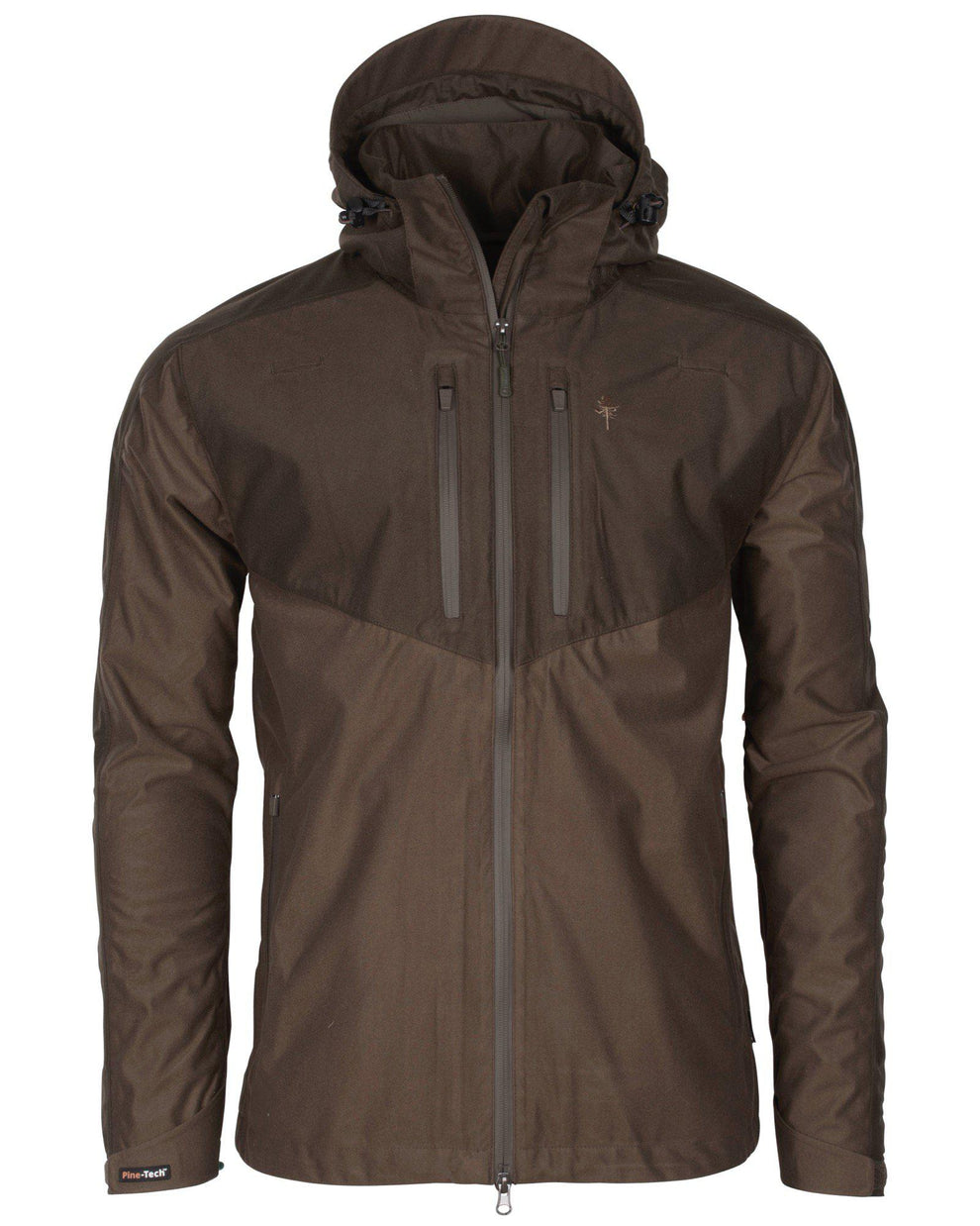 A hunting jacket with wind and waterproof membrane and good ventilation. Taped seams. Two-way zipper. Detachable hood with reinforced screen. Ventilation zipper along the sides. Radio pocket on both sides. Two front pockets. One inside pocket. Pinewood brand in synthetic leather.