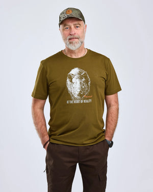 A soft and comfortable men's T-shirt featuring a sleek wild boar motif. Crafted from high-quality, GOTS certified organic cotton at 180 g/m², ensuring a more environmentally sustainable choice. The T-shirt has a classic round neckline and is the perfect garment for spring and summer days, whether for casual wear or boar hunting adventures.