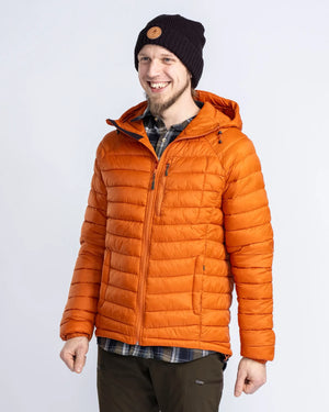 Abisko Insulation Jacket for men is a lightweight jacket with a polyester filling made from recycled PET bottles. The filling with 550+ Fillpower is blown into the channels like down, but is a more environmentally friendly alternative with the same warming properties. The jacket is windproof and treated with an organic impregnation that makes it slightly water repellent. It has front pockets and a chest pocket with zippers. It can be adjusted at the bottom with a drawstring and has a hood with a reinforced brim that can also be tightened with a drawstring to protect the head from cold and moisture.