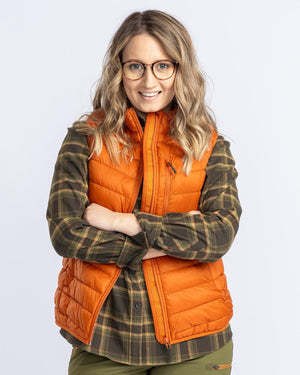 The Abisko Insulation vest for women is a windproof and slightly water repellent lightweight vest. The polyester filling is made from recycled PET bottles and is blown into the channels similar to down, but is a more environmentally friendly option with the same warming properties. The vest is incredibly soft and flexible, and can be worn both as an outer layer and as an extra warming layer under a jacket. It has two hand pockets and a chest pocket, all with zippers.