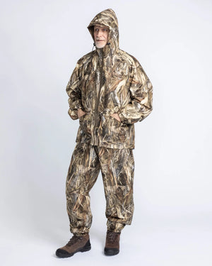 The Furudal Camou Cover Set consists of a jacket and trousers made from a soft, durable, and quiet material that is perfect for stealth hunting. The suit has been treated with an environmentally friendly and water repellent impregnation. The fit is loose to allow you to easily pull it over your hunting clothes if desired. The trousers can be tightened with a drawstring at the waist. The jacket features an adjustable hood that can be tightened with a drawstring, as well as two hand pockets with press buttons for storage. The cover set is available in two Official True Timber® Camou patterns; one for reed environments and one for forest and mountain environments.