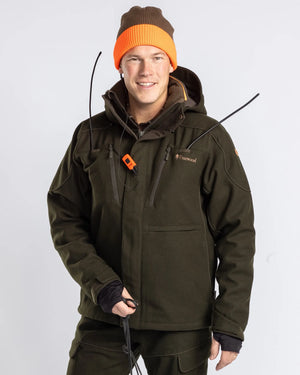 The Furudal Hunters Wool Jacket for men is designed to keep you dry, warm, and mobile during your hunting adventures. The jacket is made from a high-quality wool blend that not only provides extra warmth and strength but also is naturally water repellent. The wool is carefully selected and certified, ensuring both durability and environmental responsibility. Despite the wool's robust characteristics, the jacket maintains high breathability thanks to the fabric's construction and the body being free from membranes, which increases air circulation and reduces the risk of overheating during high and strenuous activity. The shoulder and underarm areas have a waterproof membrane to protect against moisture without compromising the jacket's overall ventilation. A mesh lining further enhances ventilation and comfort.