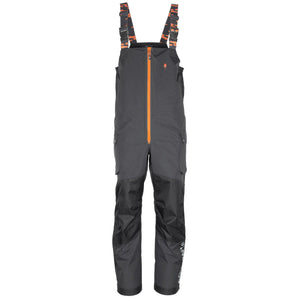 Powerful Bib 'n Brace trousers especially designed and developed for fishing. Equipped with windproof and waterproof membrane and reinforcements in knee and seat. Taped seams. Spacious hand pockets with water repellent zippers, placed under an extra water-protection cover.