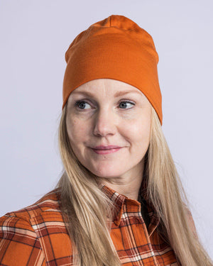 Beanie made of two layers of thin fabric with 50% merino wool for warming properties. It is plain knitted and has a soft feel, and its tight fit ensures it stays in place on your head.