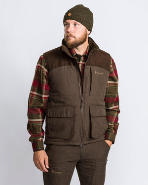 Vindtett vest i mykt og stille materiale. Foret. Fleece i kragen. Store front lommer med magnetknapper. To veis glidelås. Hånd lomme, radio lomme, to inner lommer og stor baklomme.