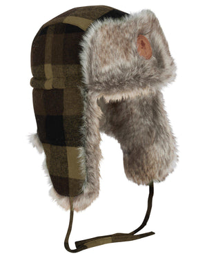 Vadderad mössa med syntetisk päls i klassiskt rutmönster och Pinewood-logga i syntetläder. Den är extra varm och öronlapparna går att knyta upp på hjässan med snören. Med den här kommer du säkerligen inte frysa om huvudet!