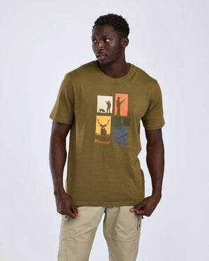 Herr t-shirt i mjukt material av 100 % återvunnet bomulls- och polyestertyg med jakttryck framtill. Eftersom färgen kommer direkt från det återvunna materialet behövs ingen ny infärgningsprocess. Det sparar både vatten och energi och ger ett melerat tyg med stilren look. Tyget har en vikt på 180 g/m2.
