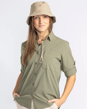 En tunn och luftig damskjorta i ett stretchigt material med UV-skydd och en impregnering som håller mygg och fästingar borta från tyget. Tyget har hög andningsförmåga och skjortan är försedd med en ventilationsöppning med mesh i ryggen för att öka luftströmningen. Skjortan är lätt i vikt och håller sig skrynkelfri länge vilket gör den smidig att bära med sig i packningen, eller till vardags när du föredrar att inte stryka dina kläder. Den har två bröstfickor fram med dragkedja samt hängare på insidan för att smidigt kunna hänga upp den på tork efter tvätt.